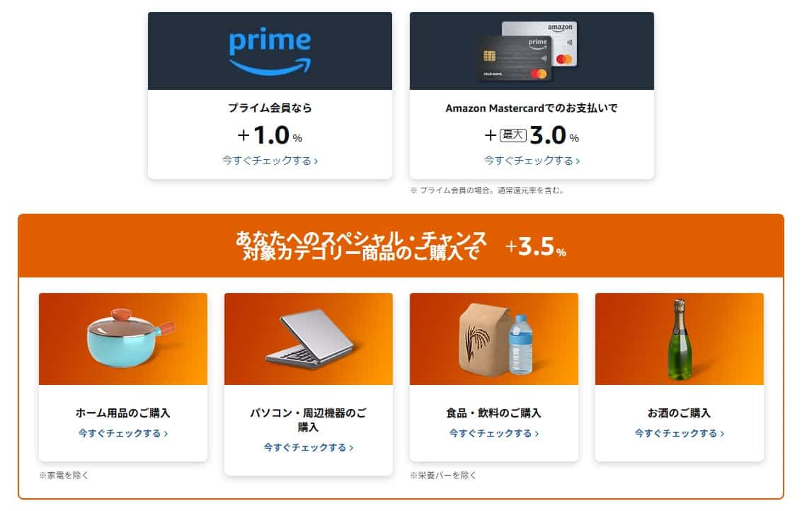 還元率の条件で一番アップ率が高いので、プライム会員というだけでお得に買い物ができます。