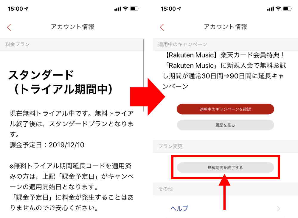アカウント情報ページの下にある「無料期間を終了する」をタップします。