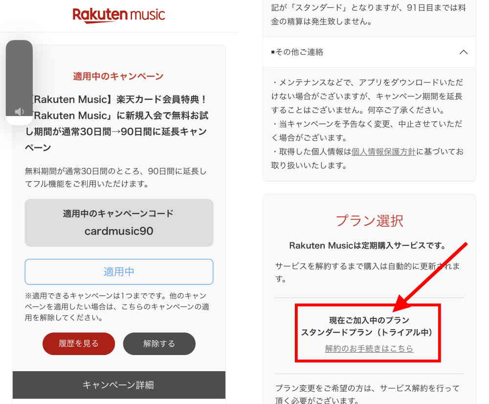 楽天ミュージックでは、契約期間中に解約したとしても期間満了まで引き続き利用できるので、忘れる不安がある人は事前に解約手続きをしておきましょう(無料体験中を除く)。